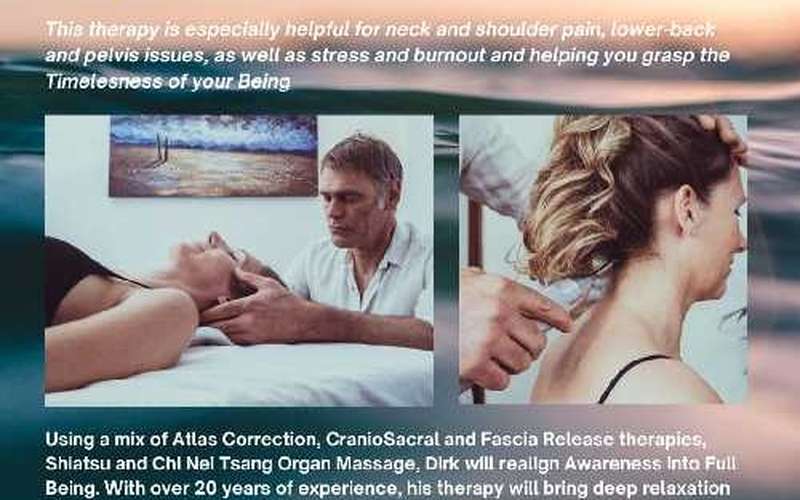 Using a mix of Atlascorrection, Craniosacral, Shiatsu,  Chi Nei Tsang organmassage Dirk realigns Awareness into Full Being. With over 20 years of experience, these sessions bring deep relaxation of mind and body. Harmonizing 'Chi' energyflow of the brain and spine. Efficient with neck and shoulderpain, back issues, stress and burnout and helping you grasp the Timelesness of your Being.  Price: 90 euros  WhatsApp: +32476 89 15 63